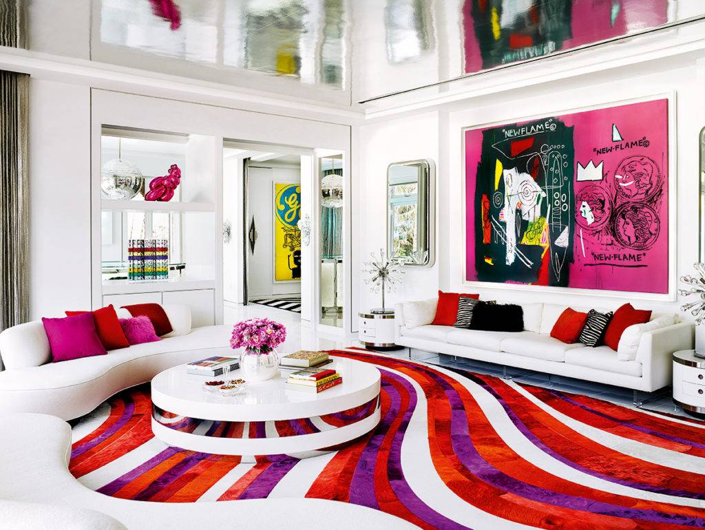 Важную роль в интерьере играет использование глянцевых поверхностей, ярких предметов мебели и узнаваемого декора: картин и фотографий с искаженной цветопередачей. Ковры, разнообразный текстиль и стильные светильники помогают сделать комнату уютной.