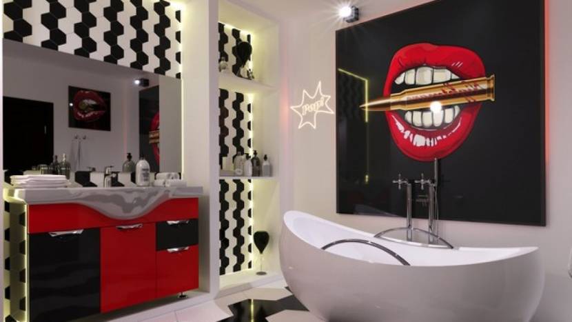 можно с легкостью украсить в любимом стиле поп-арт. Яркая плитка на полу, например лимонного цвета, и белая плитка на стенах с правильным декором стен в виде необычных полочек — практично и необычно, как и требует стиль. Даже ваш бойлер может быть украшен наклейкой с необходим рисунком в стиле поп-арт. Нескользящий коврик следует выбирать с оригинальным дизайном. Отлично подойдут геометрические фигуры.
