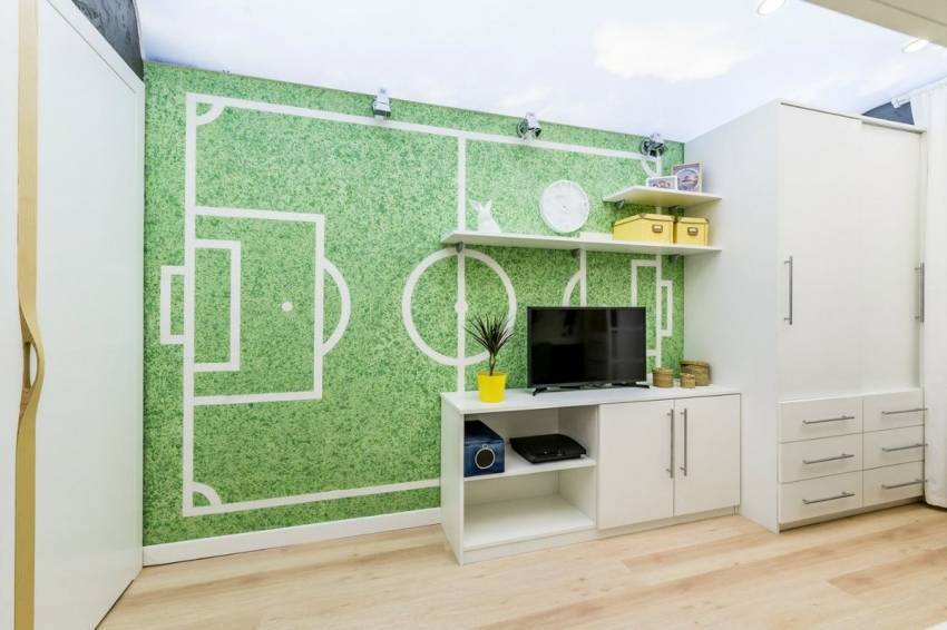 Оригинальное нанесение жидких обоев в детской комнатеИмитация футбольного поля при помощи жидких обоев