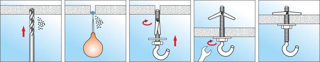 Данный способ является наиболее надежным из всех вариантов. Исполнение несложное, но необходима аккуратность. Крюк изначально может присутствовать в квартирах, еще со времени их ввода в эксплуатацию. Если не будет необходимости перенести люстру в иное место, им можно воспользоваться. В противном случае сверлится отверстие на бетонной поверхности с диаметром анкерного крюка. Его диаметр может быть от 6 до 14 мм. Когда в отверстие вставляется крюк, следует подвесную гайку закрутить до тех пор, пока не разожмется гильза.