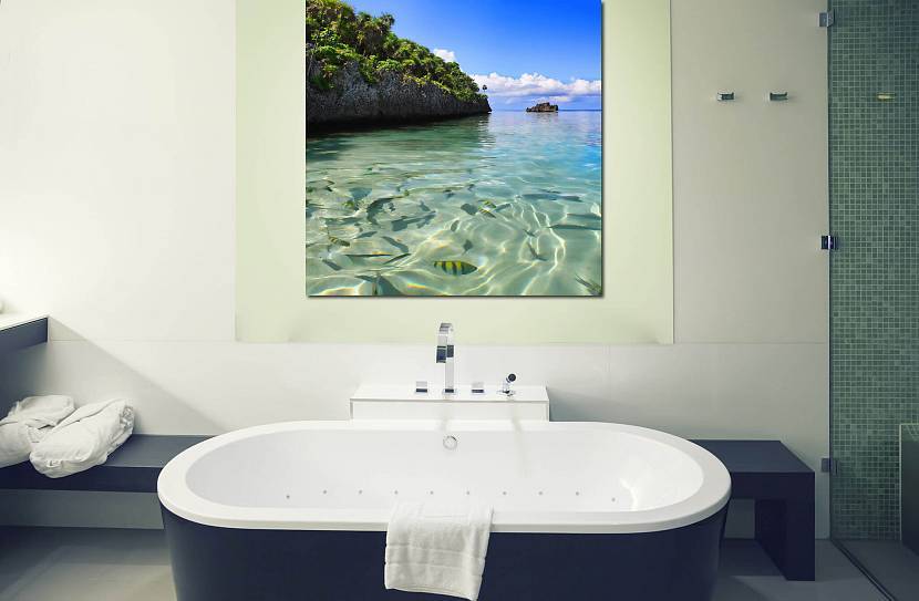 Во-первых, защитить пейзаж от влаги. В этом случае отлично выручит ламинирование. А во-вторых, выбирать сюжет с присутствием воды. В идеале это будут морские пейзажи. Но неплохо будет смотреться крупный план зеленого листа растения с блестящими под солнцем капельками росы.