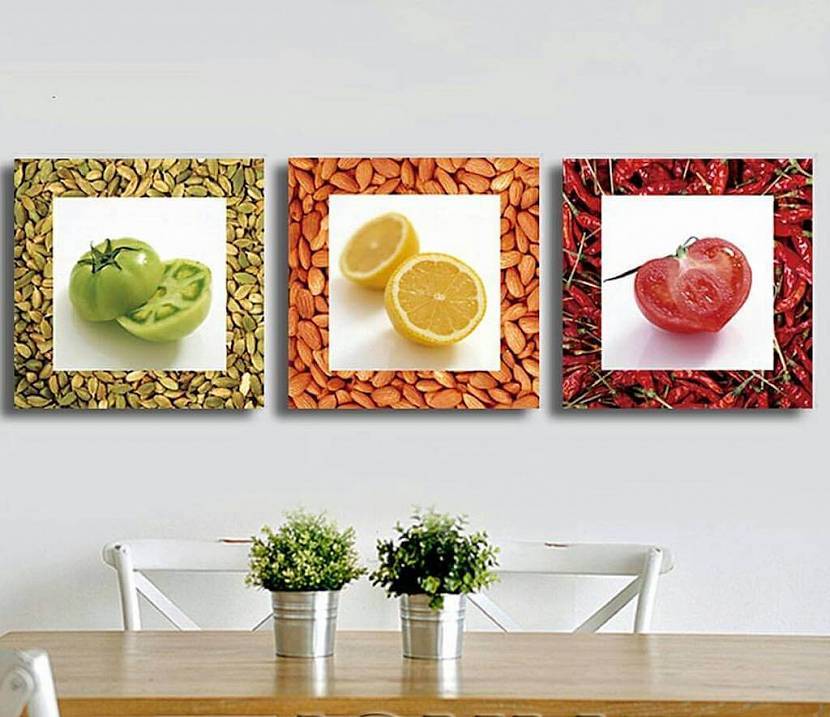 Малогабаритной кухне соответствует небольшой постер или полиптих среднего объема.