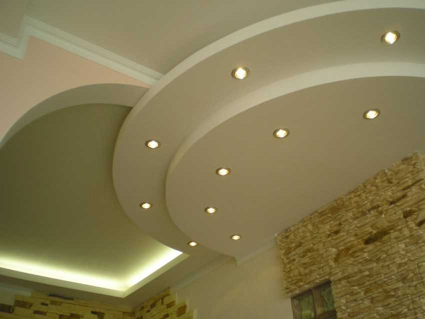 Добавив в конструкцию полукруглые углубления с встроенными в них светильниками вы придадите дополнительный объем этому сложному в оформлении помещению.