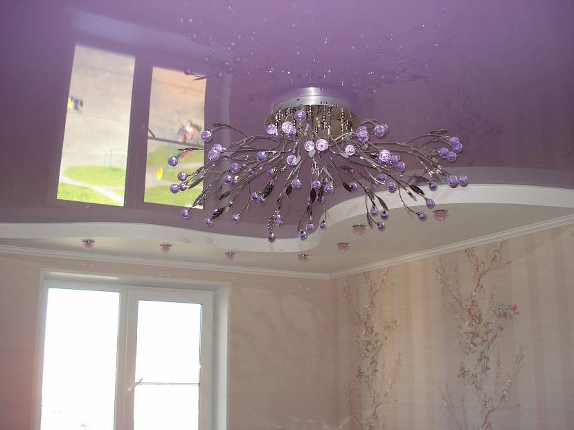 Люстра. Выступает главным источником освещения и располагается в центре потолка. Глянцевая поверхность натяжного потолка будет отражать люстру, за счет чего она зрительно увеличится вдвое. Это стоит учитывать при покупке массивных светильников. Зачастую центральный источник освещения дополнительно выделяют изысканной формой потолка.