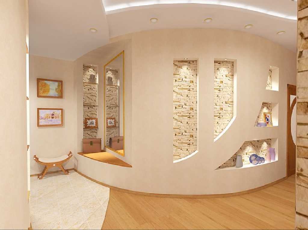 Комната, которую гость видит первой должна светиться доброжелательностью и уютом. Это помещение лишено природного света, так как здесь нет окон, поэтому о темных тонах и сложных конструкциях речь идти не может.