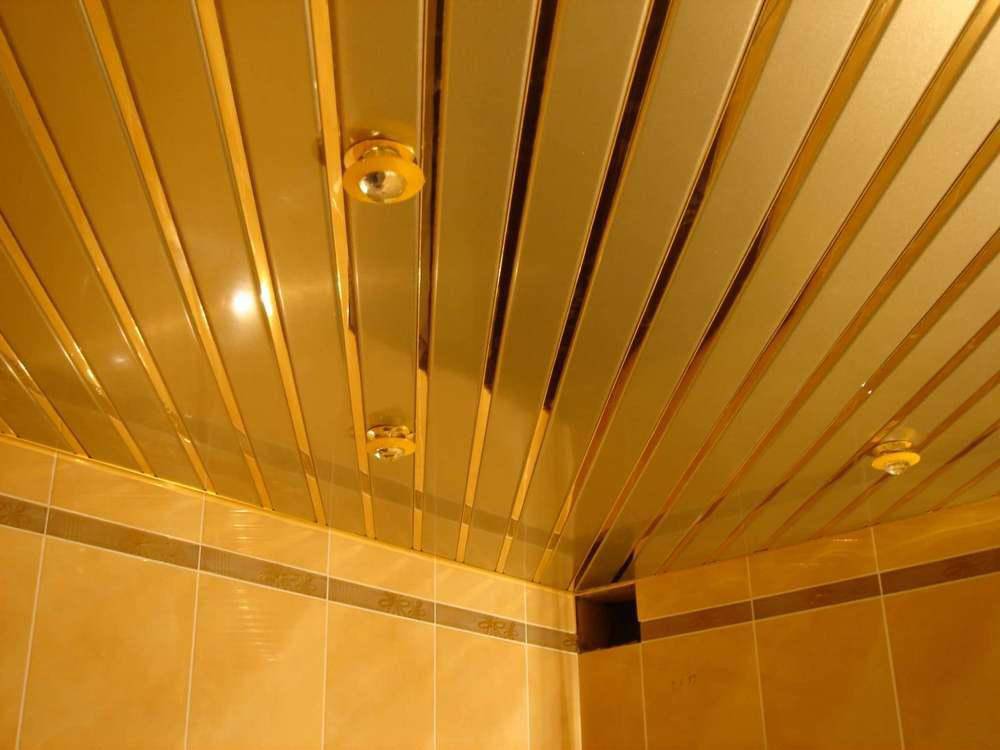Пластиковый потолок в ванной можно крепить и на деревянном каркасе выполненном из деревянных брусьев и реек. А также с помощью бескаркасной системы, когда деревянная обрешетка крепится непосредственно к черновому потолку, при условии что он ровный и не будут устанавливаться врезные( точечные) светильники.