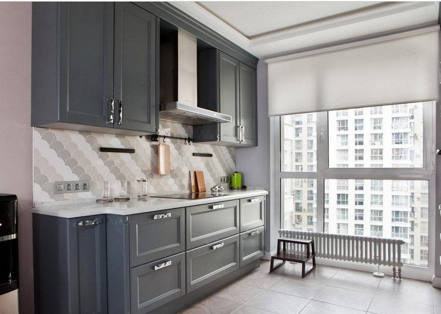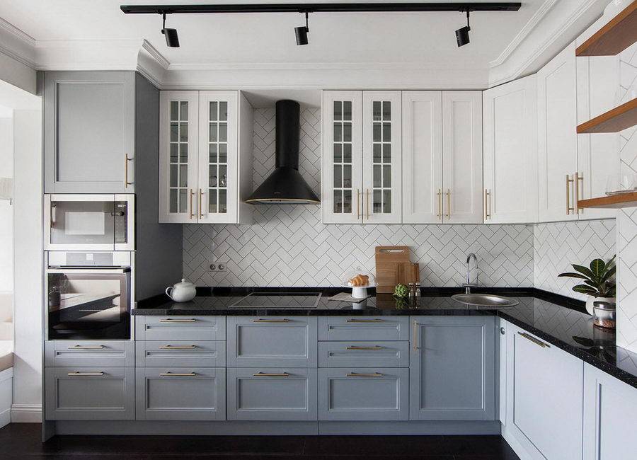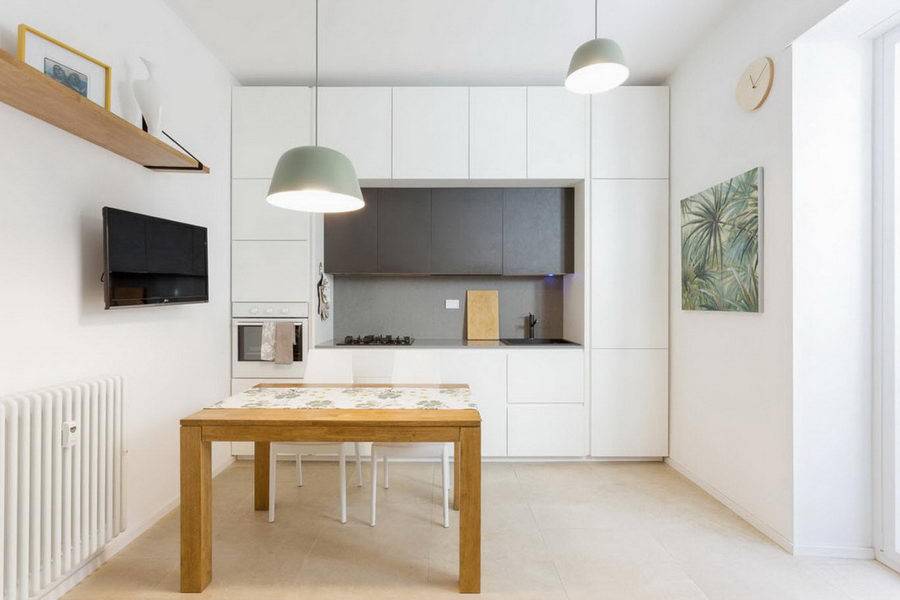 - При высоте кухни от 240 до 300 см шкафы можно сделать как высокими (до потолка), так и низкими. Но помним, что расстояние от шкафа до потолка лучше оставить побольше (около 30-40 см).