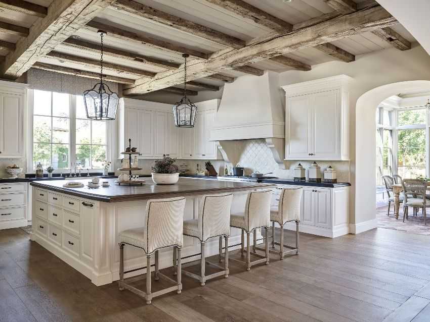 Открытые балки на потолке помогут создать неповторимый стиль деревенского дома, например, одно из направлений кантри.