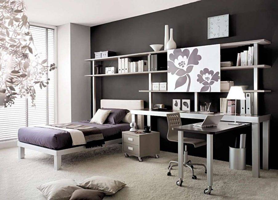 Данный стиль является самым немногословным, поэтому он особенно гармонично вписывается в интерьер небольшого помещения и спальни для более взрослого подростка 16-ти, 17-ти лет. Минимализм обладает ограниченным количеством оттеночных вариаций и в основном отличается модульной, закрытой и немного приземленной мебелью.