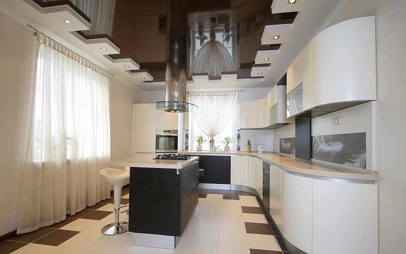 Комбинированные потолки (контрастные, монохромные) притягивают взор к деталям отделки. При выборе цвета используют не более 3 тонов, иначе оформление надоест и будет раздражать. Можно применять как мягкие градиентные переходы, так и резкую полярность. Темные и светлые части помогают в зонировании кухни.