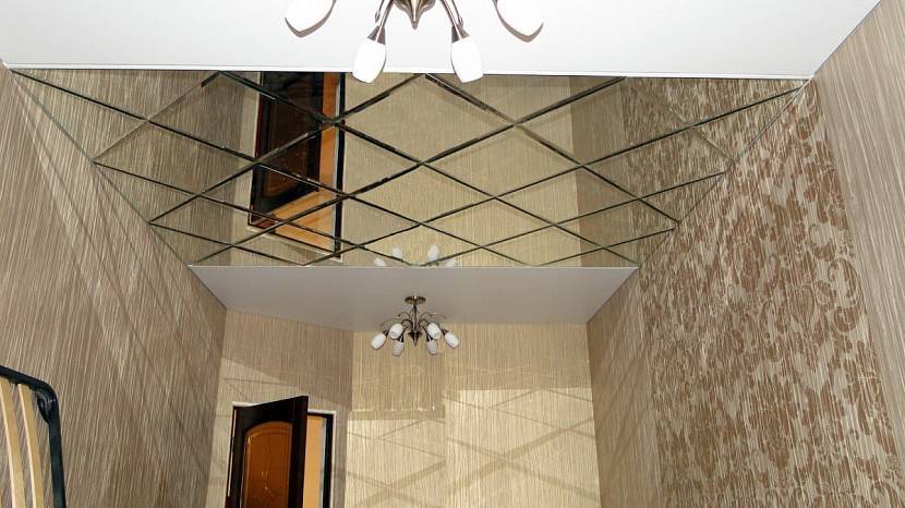 Зрительно увеличить пространство поможет зеркальная плитка. Отражающие свойства материала увеличивают освещенность помещения. Материал необходимо крепить к ровной поверхности, для этого поверхность потолка выравнивают штукатуркой или шпаклевкой.
