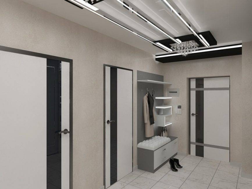 Натяжной потолок может привнести в общий облик коридора впечатляющий положительный эффект.