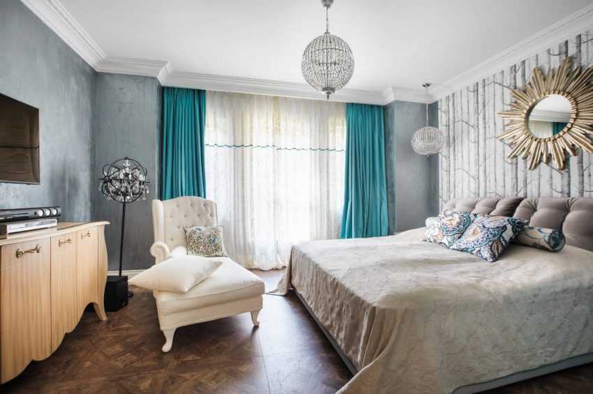 Из более ярких оттенков современный интерьер спальни хорошо смотрится со спокойными зелеными, умиротворяющими синими, элегантно серыми тонами.