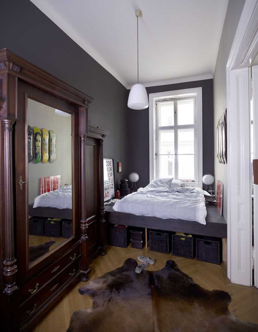 Своеобразная конструкция помещения, находящегося непосредственно под кровлей дома, определяет особенности его обустройства: размещения мебели и других предметов интерьера. Для максимальной рационализации жилого пространства целесообразно использовать в дизайне спальни в доме с мансардой мебельные конструкции модульного типа. Заранее продумывают места установки оконных проемов, обеспечивающих доступ дневного света, и возможность удобного расположения мебели. Высота потолков в комнате должна быть комфортной для жильцов. Важными элементами интерьера подобного помещения становятся опорная система и кровельный скос, от них зависит процесс распределения мебели, обшивки стен и потолка.