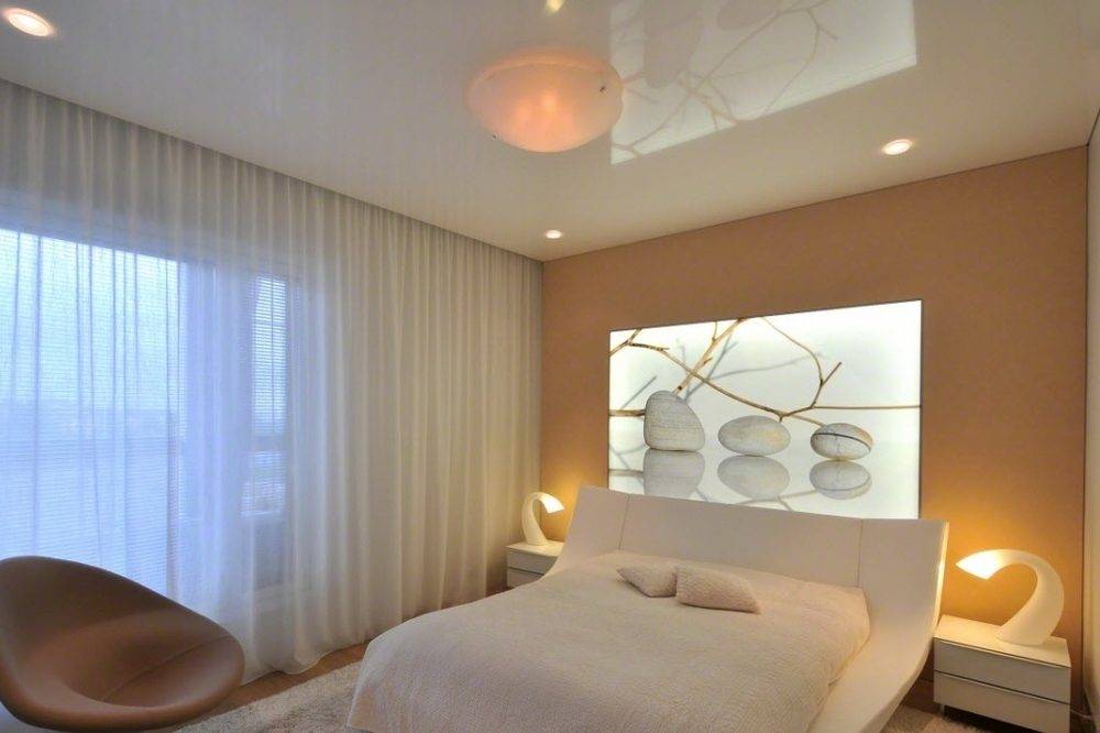 минимализм. Глянцевые или матовые белые полотна – идеальное решение для лаконичного стиля. Допускаются и контрастные к стенам потолки, но только если размеры спальни позволяют;
