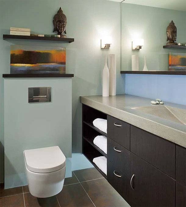 Приверженцы учения Фен-Шуй должны подобрать в интерьер туалета аксессуары, сантехнику и отделку в цветах, несущих энергию воды. Это мягкие зеленоватые, голубые и белые оттенки.