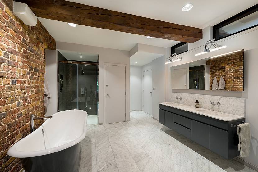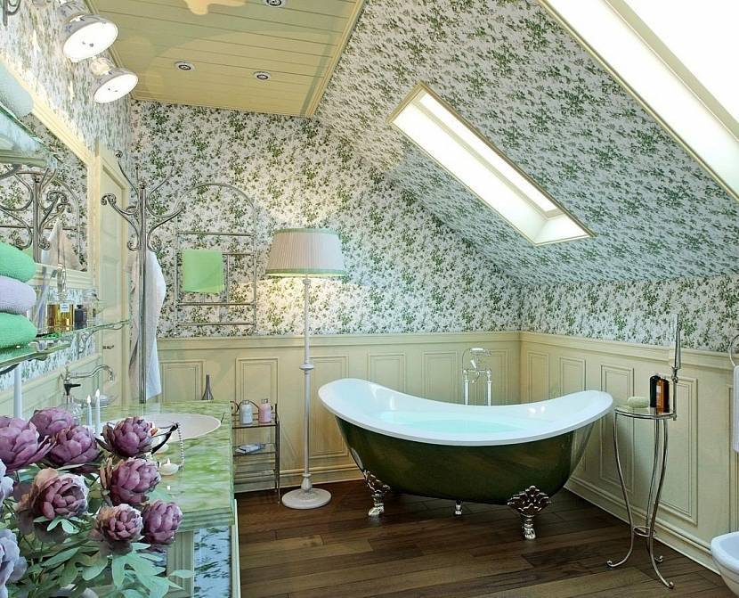 Современный подход к планировке ванной позволяет расположить ее в самых необычных местах. Это может быть 2-й этаж строения, веранда закрытого типа и даже мансарда. В последнем случае оформление усложняется формой кровли, которая является одновременно потолком и стенами мансардного строения. Оформить потолок будет сложнее из-за угла наклона, наличия балок, стропильных ног, окон.
