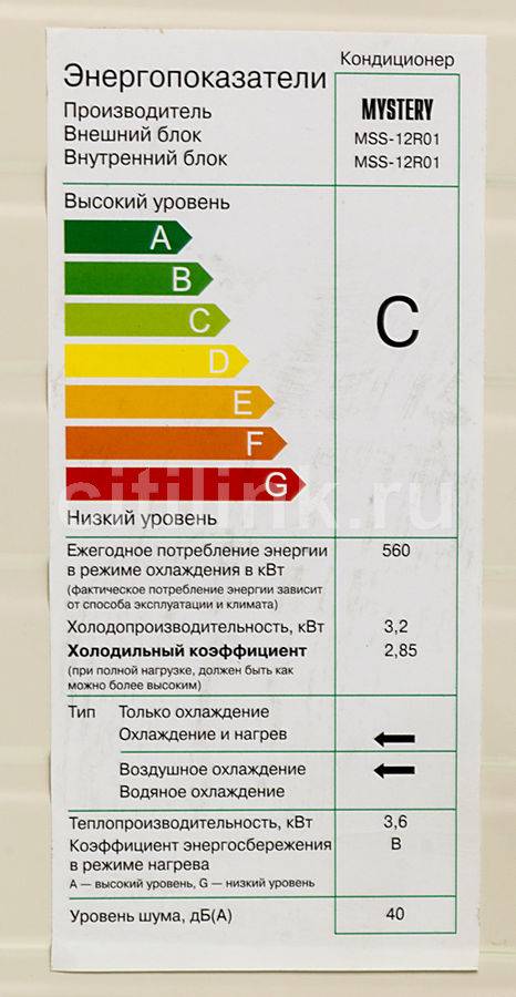 Для обозначения энергоэффективности бытовой техники существует семь категорий, обозначаемых буквами от A (лучшей) до G (худшей). Кондиционеры категории “A” имеют COP > 3.6 и EER > 3.2, а категории “G” — COP < 2.4 и EER < 2.2.