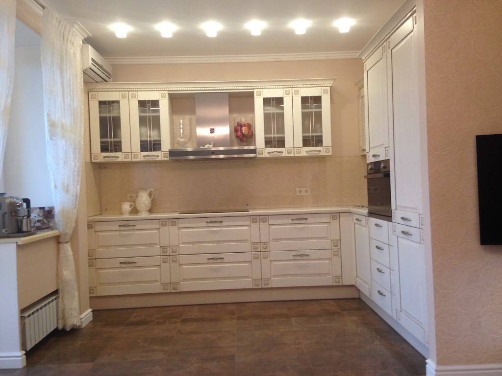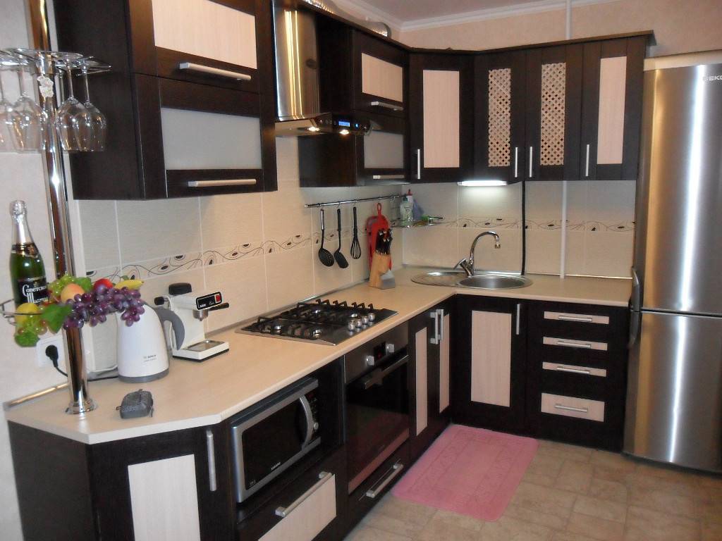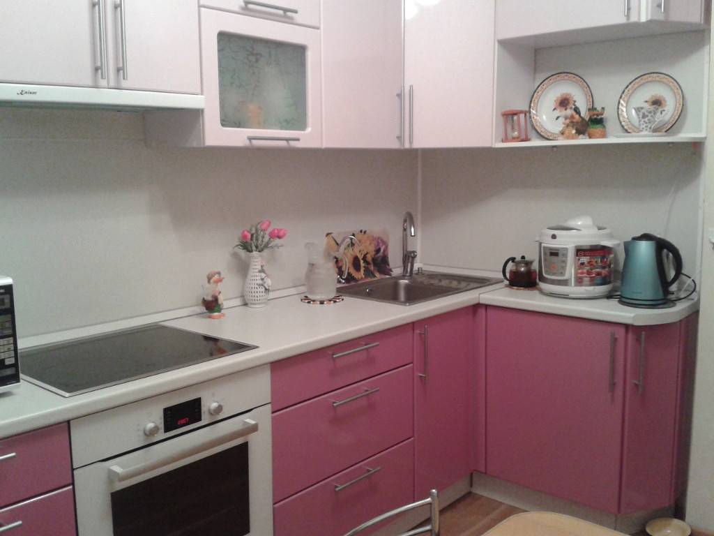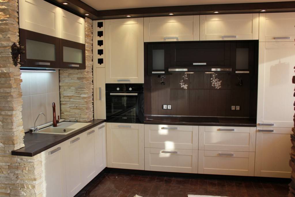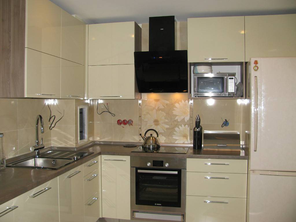 Итак, первым из них является расположение гарнитура вдоль двух перпендикулярных стен. Это классический вариант. Его также можно считать наиболее универсальным, так как подходит для большинства помещений. Кроме того технику и шкафы в этом случае можно расставить по своему вкусу.