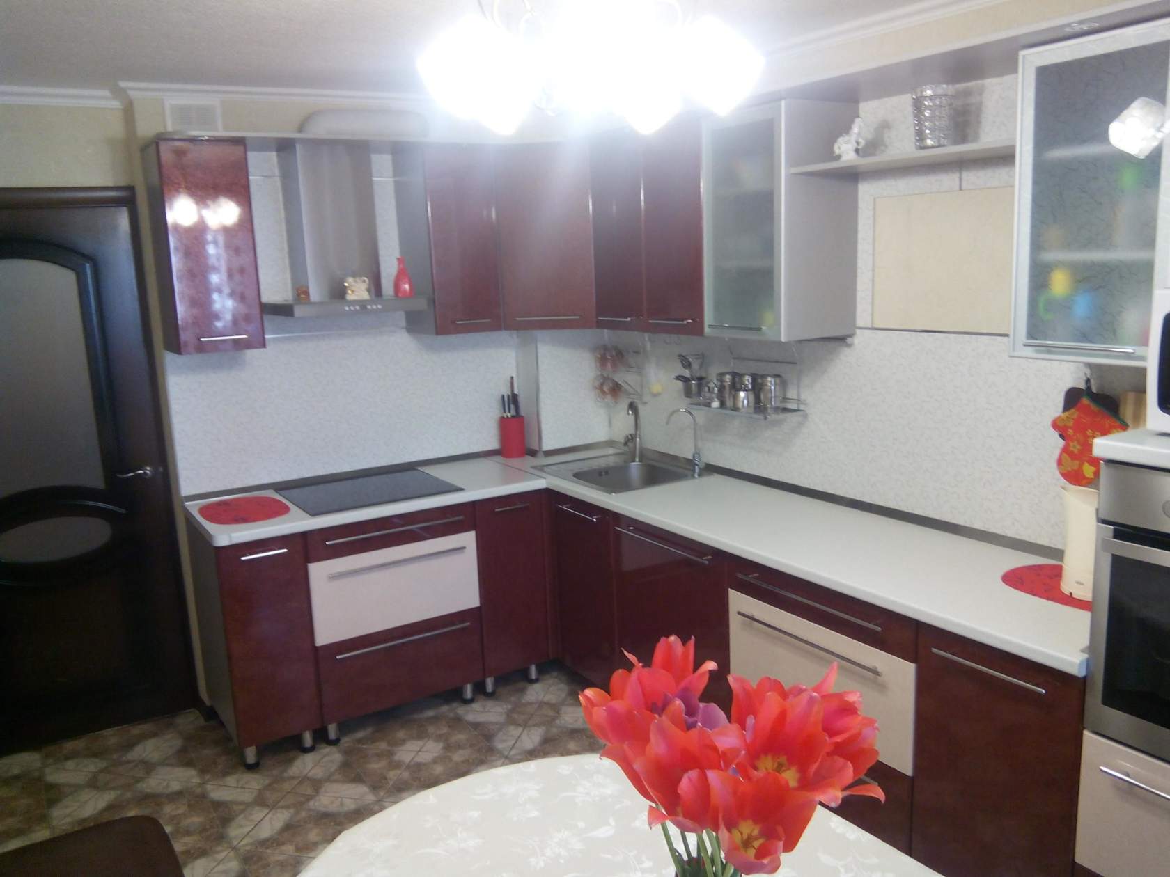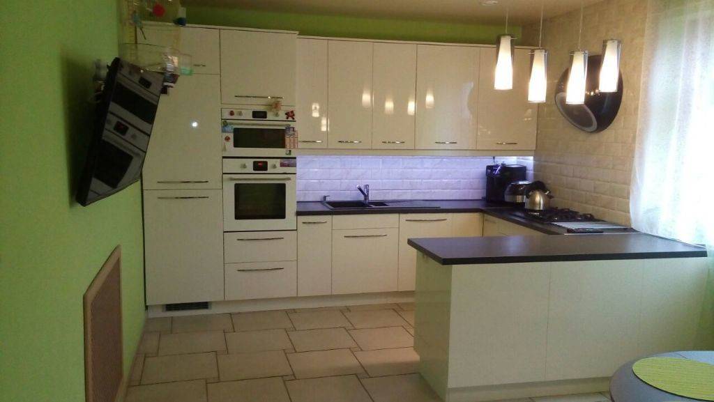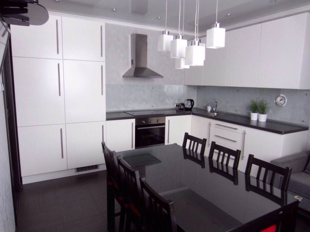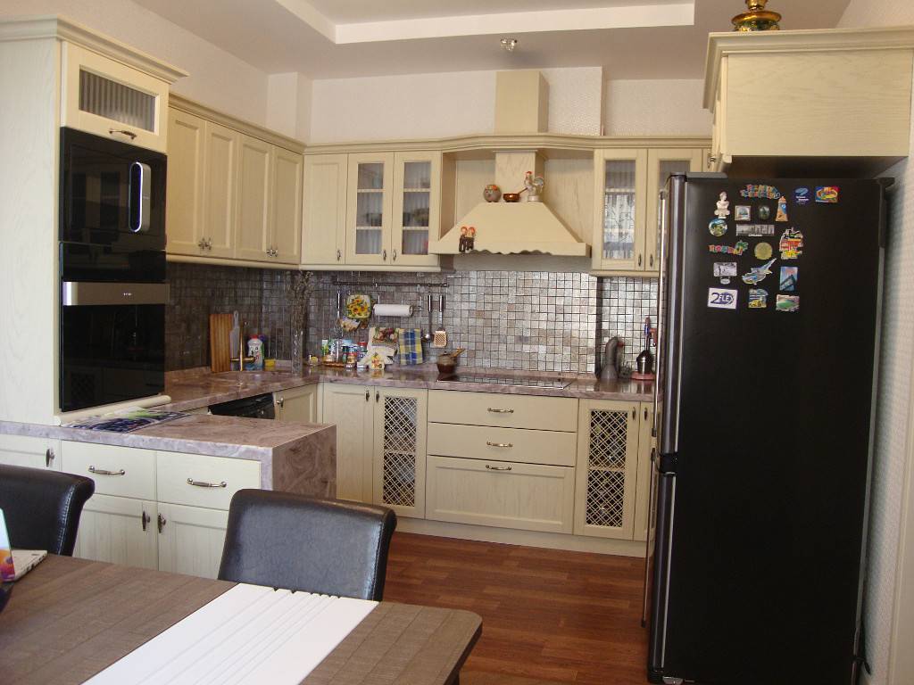 Итак, первым из них является расположение гарнитура вдоль двух перпендикулярных стен. Это классический вариант. Его также можно считать наиболее универсальным, так как подходит для большинства помещений. Кроме того технику и шкафы в этом случае можно расставить по своему вкусу.