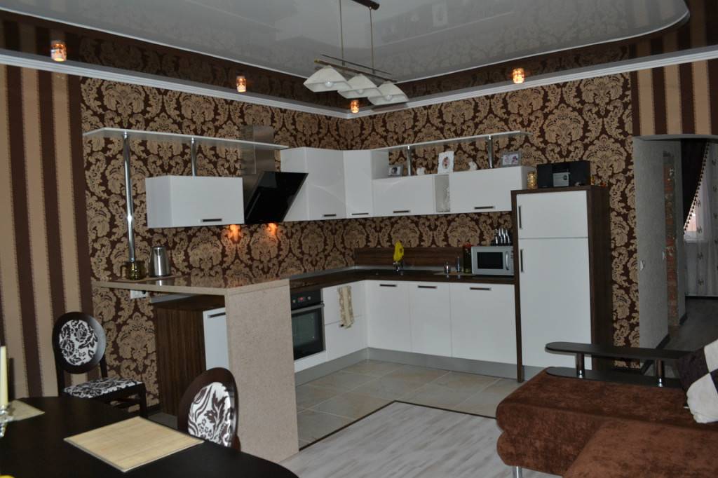 При этом перепады уровней не должны быть большими. Стык потолка и стен следует украсить потолочными плинтусами из полиуретана или гипса. Накладные элементы в виде лепнины можно использовать, если помещение кухни просторное, а сами потолки — высокие.