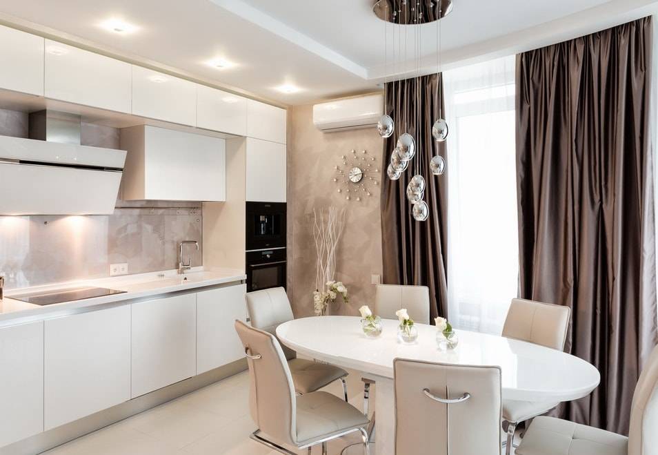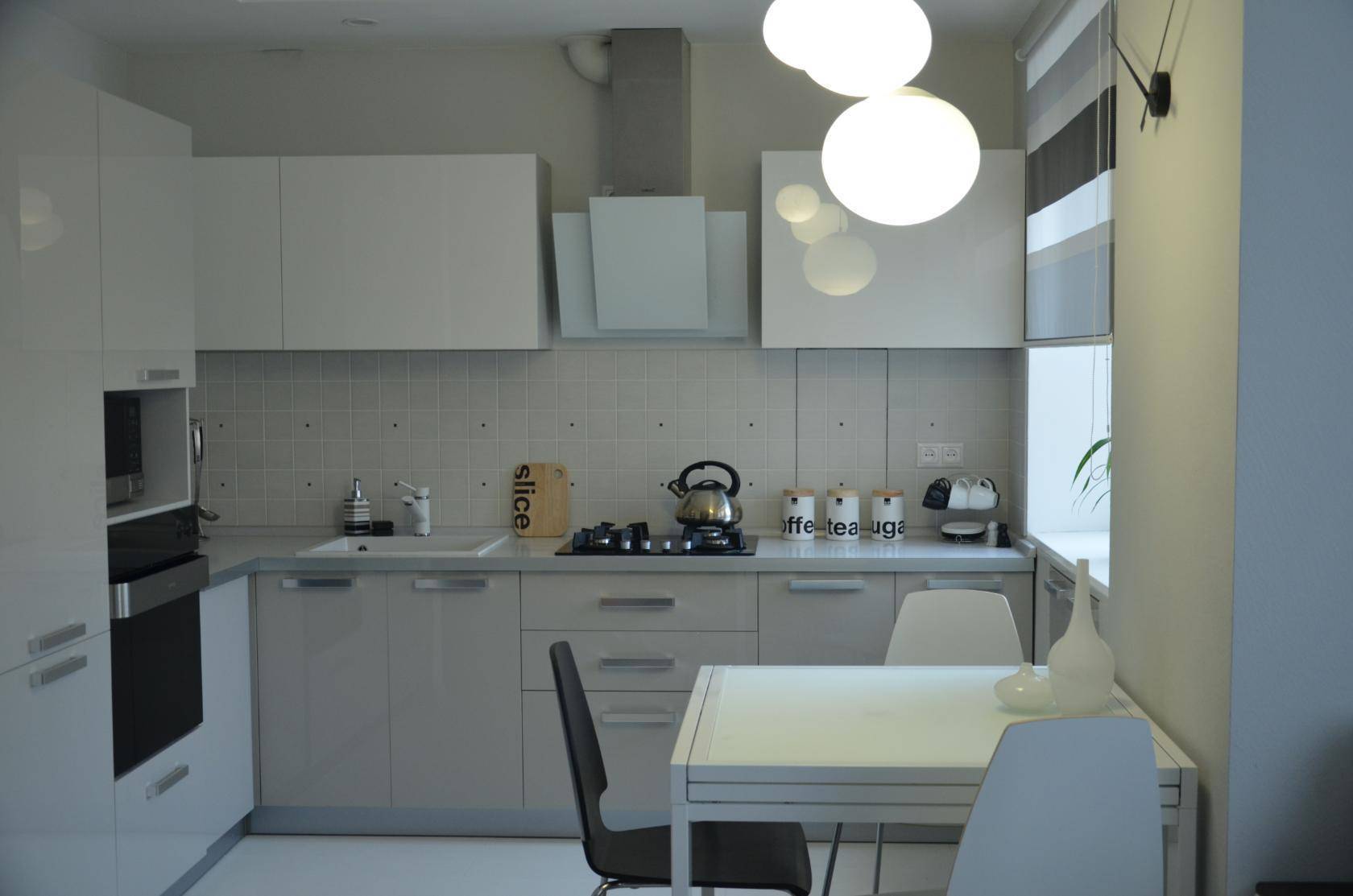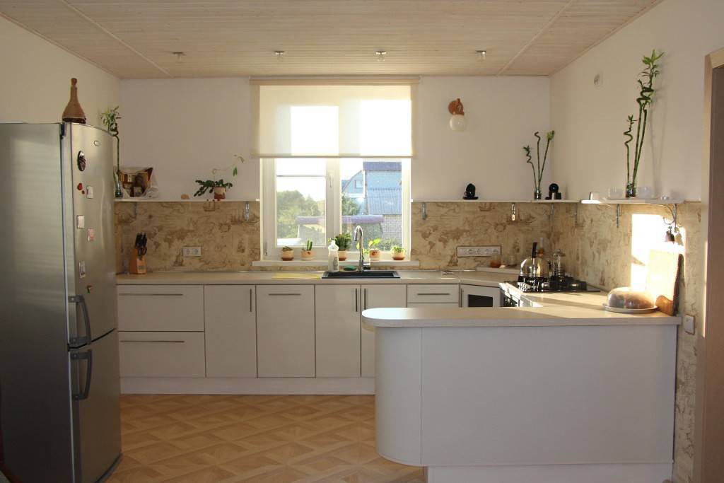 Идеальный вариант для тех, кто ценит простоту, функциональность и элегантность. Обустроить такое помещение довольно просто, для отделки стен можно использовать любые материалы: штукатурку, моющиеся обои, гипсовые панели, керамическую плитку. Светлые тона наполнят кухню легкостью, сделают ее более просторной.