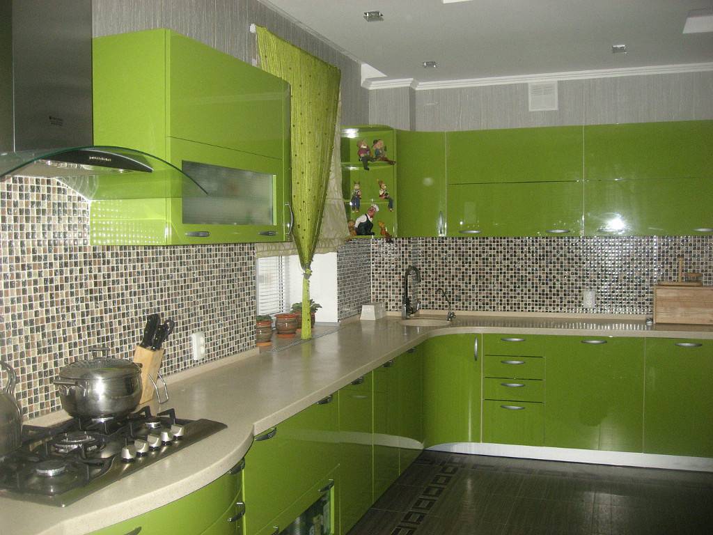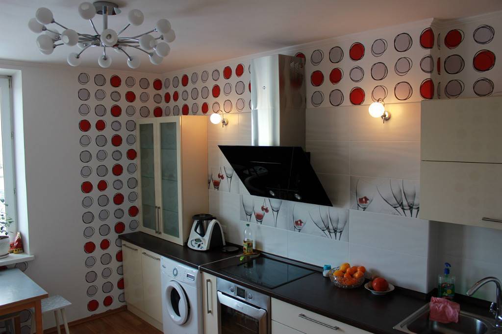 Для отделки стен лучше всего использовать штукатурку, краску либо моющиеся обои. Кухонный гарнитур необходимо выбирать современный, изготовленный из синтетических материалов (пластика, стекла, искусственного камня, металла). Пол стоит сделать светлым, для этого прекрасно подойдет ламинат.