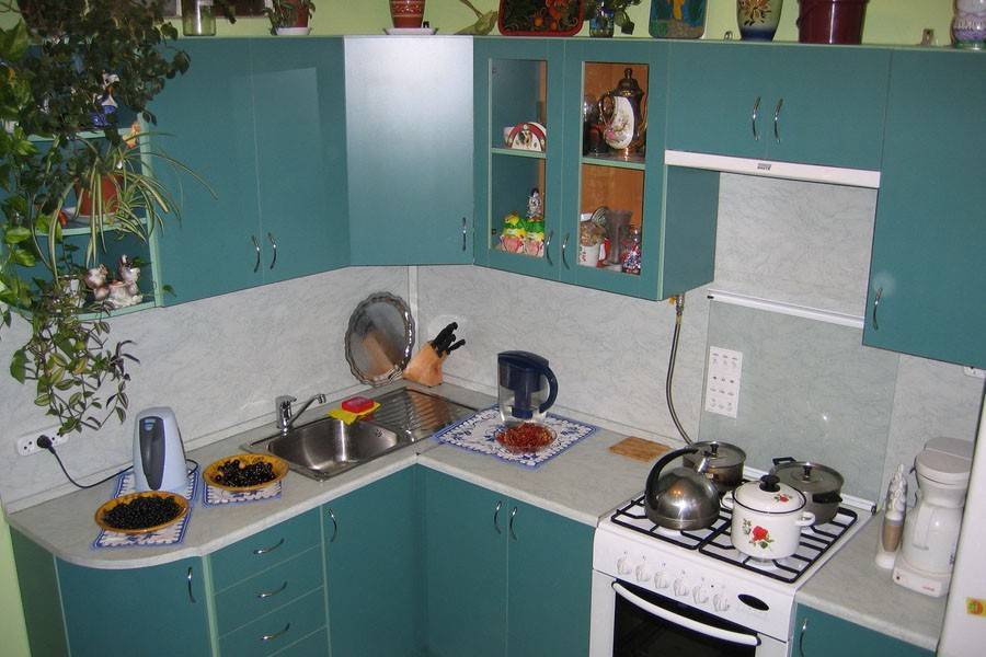 Традиционно в хрущевских квартирах мойка размещалась в углу, там, где проходят трубы водоснабжения и слива. Конечно, так намного выгоднее и удобнее при строительстве — нет нужды тянуть трубы в другой конец помещения.