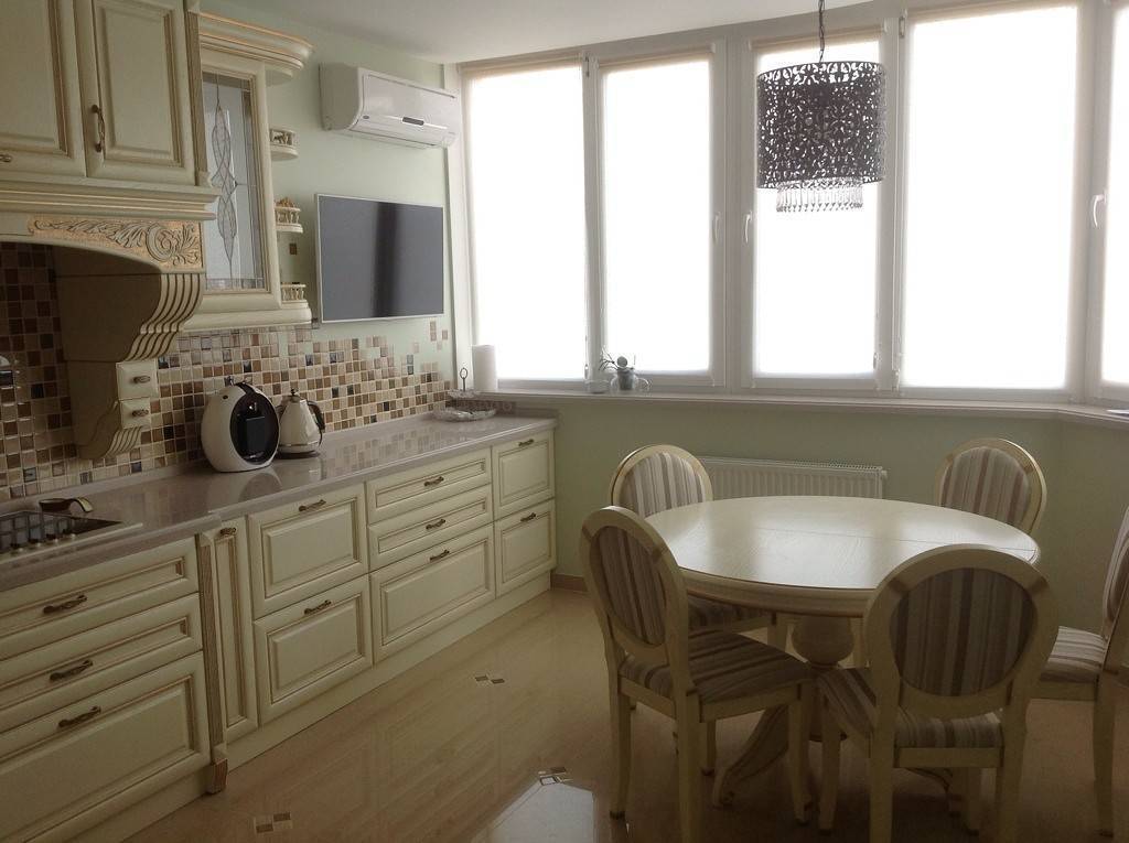 В этом варианте речь идет именно о лоджии, так как совместить кухню с балконом вряд ли удастся. Сделать это можно двумя способами: либо сохранив перегородку, но убрав оконный блок, либо убрав и то, и другое. Во втором случае также придется получать разрешение в БТИ, так как речь идет также о переносе радиаторов отопления.