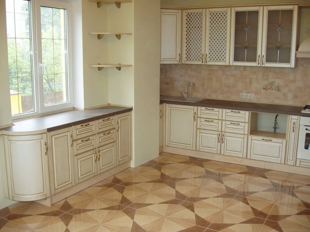 В идеале, он должен быть деревянным (это могут быть широкие доски, либо паркет). Однако в реальности такой вариант не всем доступен, кроме того, он не особо практичен именно для кухни. По этой причине разрешено использовать качественный ламинат, максимально реалистично выполненный под натуральное дерево.