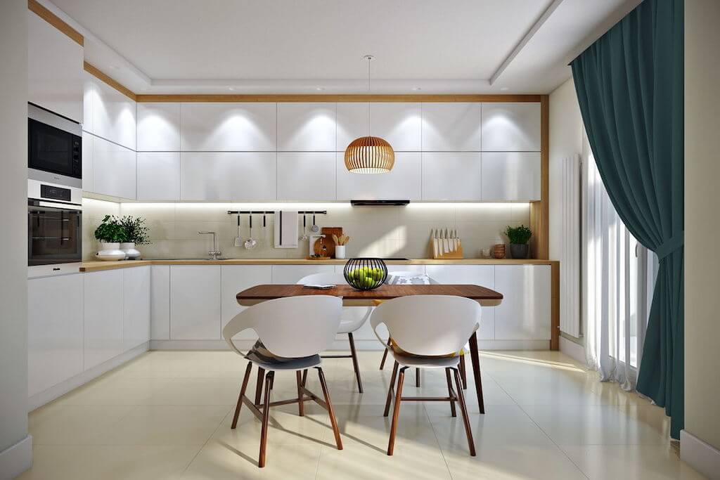 Если у вас угловая кухня, и этот угол не освещён, то располагать там обеденную зону мы не рекомендуем (хотя, она просто туда просится, чисто визуально). Лучше стол поставить у окна, а в тёмный угол холодильник и прочую технику.