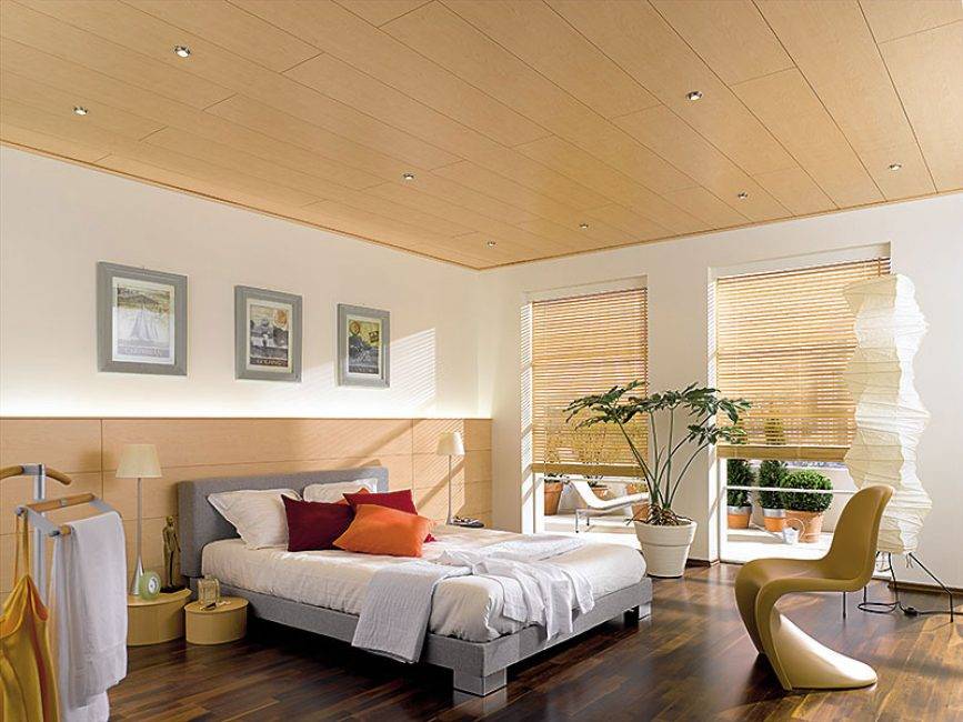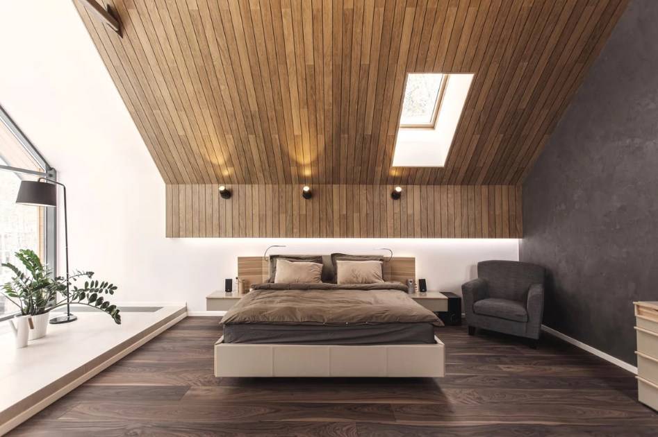 Некоторые читатели могут удивиться, но в последнее время всё чаще появляется запрос от клиентов на отделку потолка паркетом или ламинатом. Такой современный потолок с фактурой дерева отлично впишется в эко-дизайн, лофт, рустик, минимализм.