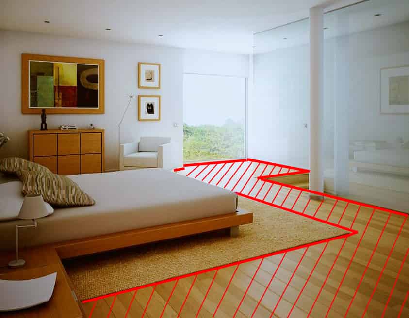 - Навсегда откажитесь от идентичного оформления потолка и пола. Это касается не только цвета, но и фактуры отделочных материалов. Это создаст визуальный дисбаланс и очень сильно повредит реальному объему комнаты.