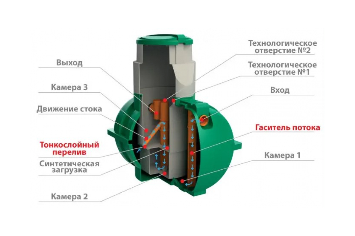 Последняя камера имеет вывод для прошедшей обработку жидкости. Причем если она очищена полностью, то вывод производится прямо в грунт. Если жидкость очищена только на половину, то ее отводят для почвенной доочистки.