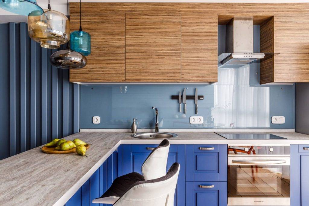 - Вытяжку выбирают согласно размерам кухни. Если площадь большая, устройство должно быть более мощным. Для маленькой кухни подойдет подвесная вытяжка рециркуляционного типа. Она компактна, поэтому сохранит место для дополнительного навесного шкафчика.