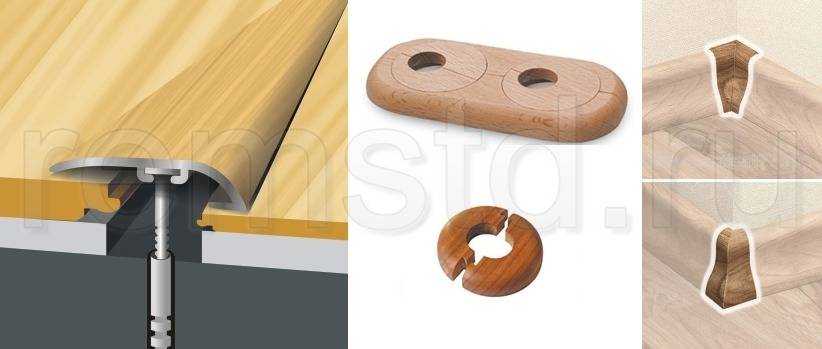 Чтобы скрыть деформационные зазоры на переходах к другим покрытиям (слева), к стенам (справа), к нагревательному оборудованию (в центре), применяют различные декоративные элементы: плинтусы, галтели, цокольные рейки и розетки для систем отопления.
