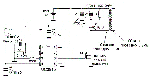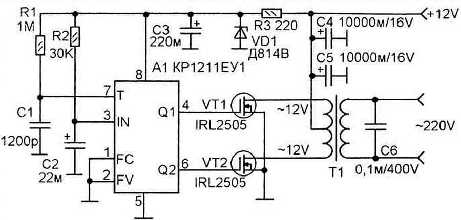 Схема состоит из задающего генератора (микросхема А1 — КР1211ЕУ1, зарубежного аналога не имеет — это задающий генератор с двумя выходами: прямым и инверсным, соответственно 4 и 6), двух ключей (полевики VT1 и VT2), трансформатора Т1 (повышающего).