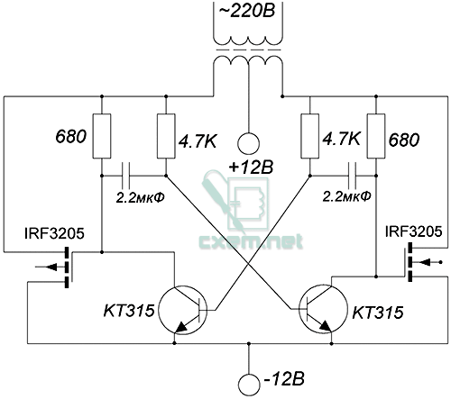 Конденсаторы – являются частотнозадающими, их емкость 4.7мкФ, при таком раскладе компонентов мультивибратора, частота инвертора будет в районе 60Гц. Трансформатор я взял от старого бесперебойника, мощность транса подбирается исходя от нужно (расчетной) мощности инвертора, первичные обмотки 2 по 9 Вольт (7-12 Вольт), вторичная обмотка стандарт – сетевая. Конденсаторы пленочные, с расчетным напряжением 63/160 и более вольт, берите та, что есть под рукой.