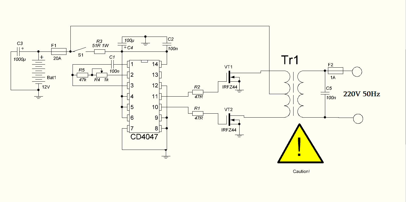 Данная схема позволяет получить на выходе почти сетевые 220 Вольт с частотой 50Гц (зависит от частоты мультивибратора. На выходе нашего инвертора прямоугольные импульсы, но с выводами прошу не спешить – такой инвертор пригоден для питания почти всех бытовых нагрузок, за исключением тех нагрузок, которые имеют встроенный двигатель, который чувствителен к форме подаваемого сигнала.