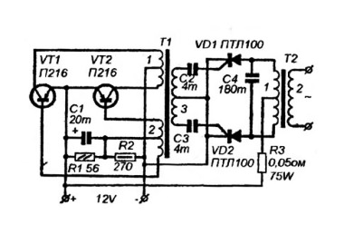 Предназначен для нагрузки до 1000 Вт, требующей переменного напряжения 220В. Использованы старые транзисторы П216, которые радиолюбители еще могут найти в своем хозяйстве.