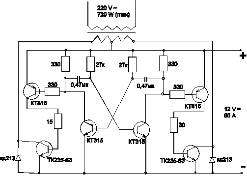 Неполярный конденсатор С4 (его емкость) подобран так, что его напряжение поочередно закрывает тиристоры. Резистором R3 защищаются цепи 12 В от перегрузки во время открывания тиристора.