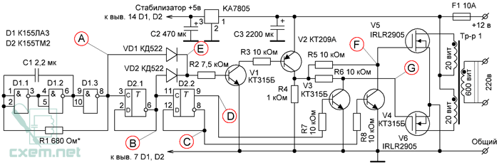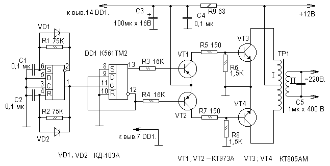 Сегодня в конструкциях инверторов уже не используются обычные трансформаторы, которые обеспечивали высокочастотные преобразования на 220В. В преобразователях применяются импульсные схемы, обеспечивающие такой же результат. Для самодельного устройства подойдет микросхема К561ТМ2 с двумя D-триггерами. Один триггер DD1 является задающим генератором, а второй – DD1.2 – служит делителем частоты. Преобразование напряжения осуществляется силовыми транзисторами КТ827 или КТ819. Более качественное преобразование выполняется полевыми транзисторами IRFZ44, выдающими максимально чистую синусоиду.