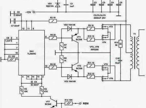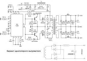 В зависимости от наличия радиодеталей и возможности их приобретения, схемы собираемого инвертора, могут быть различны. Наиболее просто изготовить выпрямитель на основе ШИМ-контроллера марки TLT494 (схема приведена ниже):