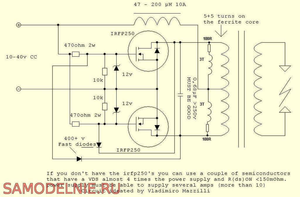 Схема очень проста. При правильной сборке она начинает работать сразу, не требует точной настройки. Отдавать в нагрузку она сможет ток до 2,5 А, но оптимальным режимом работы будет ток не более 1,5 А — а это более 300 Вт мощности.