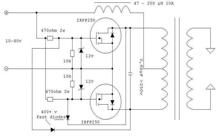 Для получения контура частотой 50 Гц используется вторичная обмотка с параллельно соединенными конденсаторами электролитического типа и нагрузка. Без этой нагрузки, подключаемой на выходе, устройство не будет работать. Только после подключения какого-либо потребителя, начнется преобразование напряжения из 12 вольт в 220. Существенным недостатком подобных схем является не совсем качественное выходное напряжение. Чтобы увеличить мощность устройства потребуются более эффективные, но и более дорогостоящие транзисторы. Конденсатор, подключаемый к выходу, рассчитывается на минимальное напряжение в диапазоне от 250 до 300 вольт.