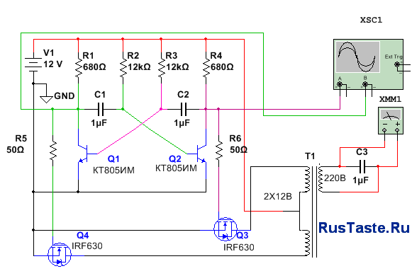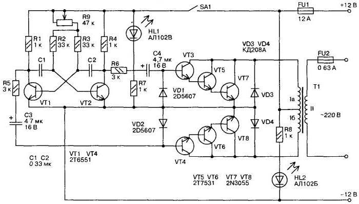 Данная схема известна еще радиолюбителям СССР. Однако это не делает ее неэффективной. Наоборот, она очень хорошо себя зарекомендовала, а главный ее плюс — получение стабильного переменного тока с напряжением 220В и частотой 50 Гц.