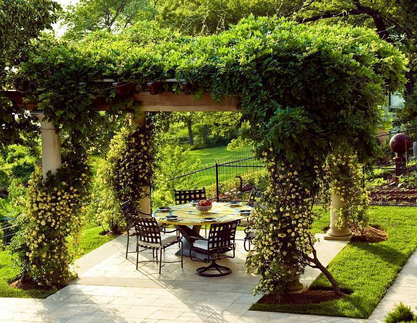 - перголы (открытые беседки), увитые вьющимися растениями;