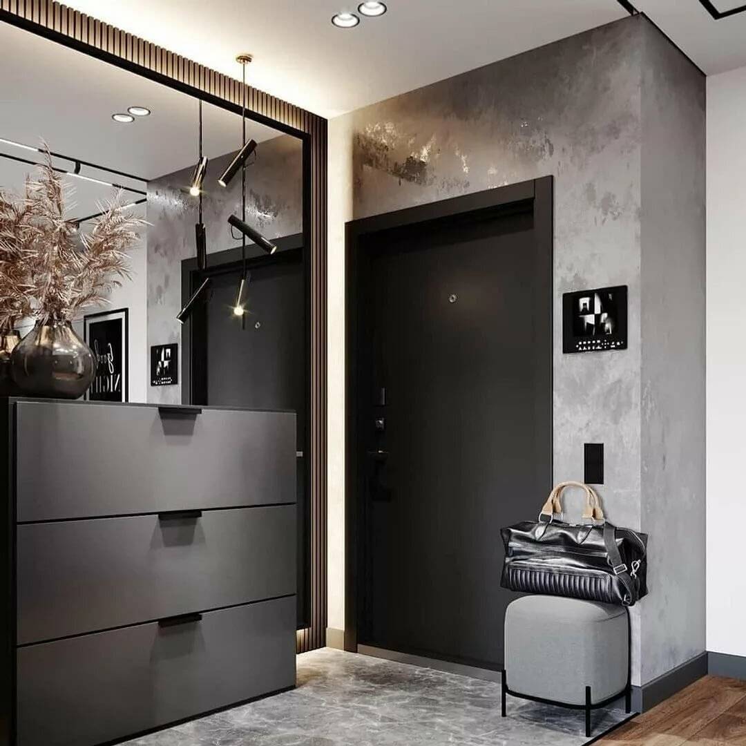Преобладание темно-серого и черного цветов, даёт ощущение защиты. В таких тонах оформляют четкие, строгие прихожие, без излишеств, хорошо гармонируют с зеркалами.