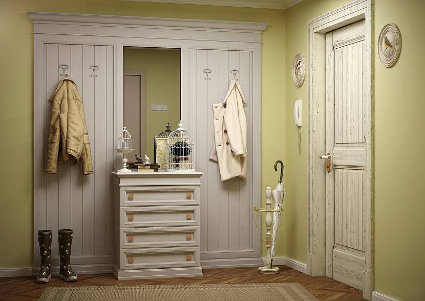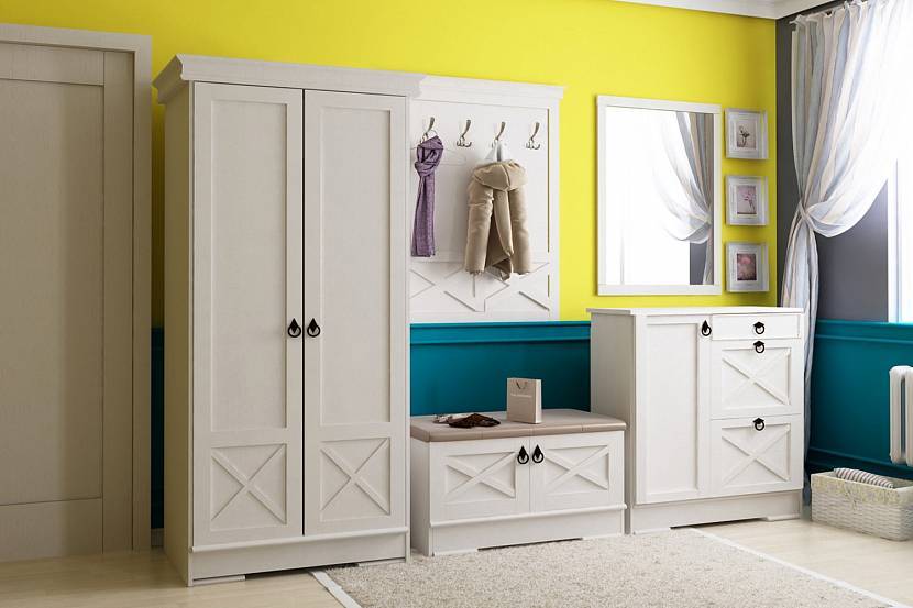 Белые цвета не должны быть экспрессивными. Используются такие варианты, как: молочный, слоновая кость, с добавлением светло-серого градиента. Часто прихожая в стиле прованс имеет светлую мебель, которую устанавливают на фоне стен с контрастной отделкой. Стены приглушенного лимонного, желтого, оливкового тона, цвета морской волны, натурального оттенка травы. А мебель белая или из светлых пород дерева.