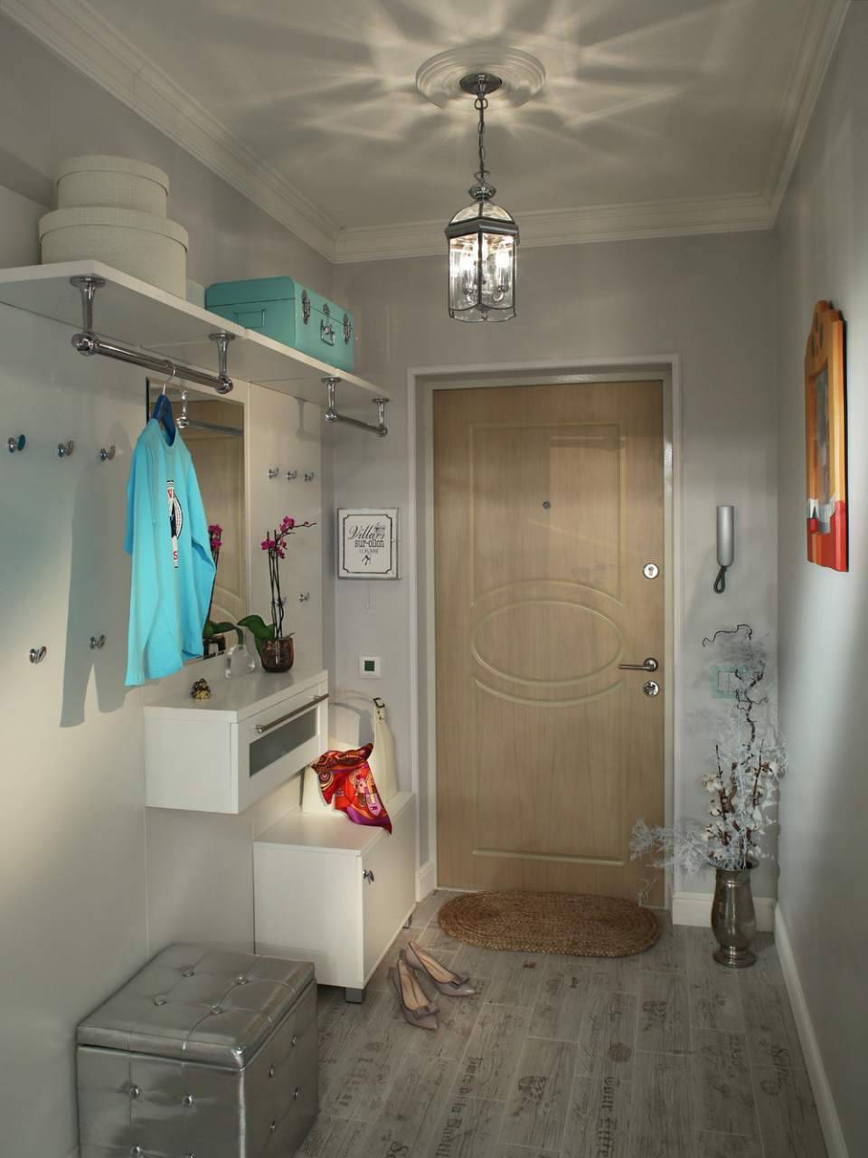 В длинной прихожей, когда ее торец упирается в стену, можно организовать небольшую гардеробную или кладовую. Возможно, для этого потребуется немного сместить дверные проемы, но помещение приобретет форму правильного квадрата, станет более функциональным.
